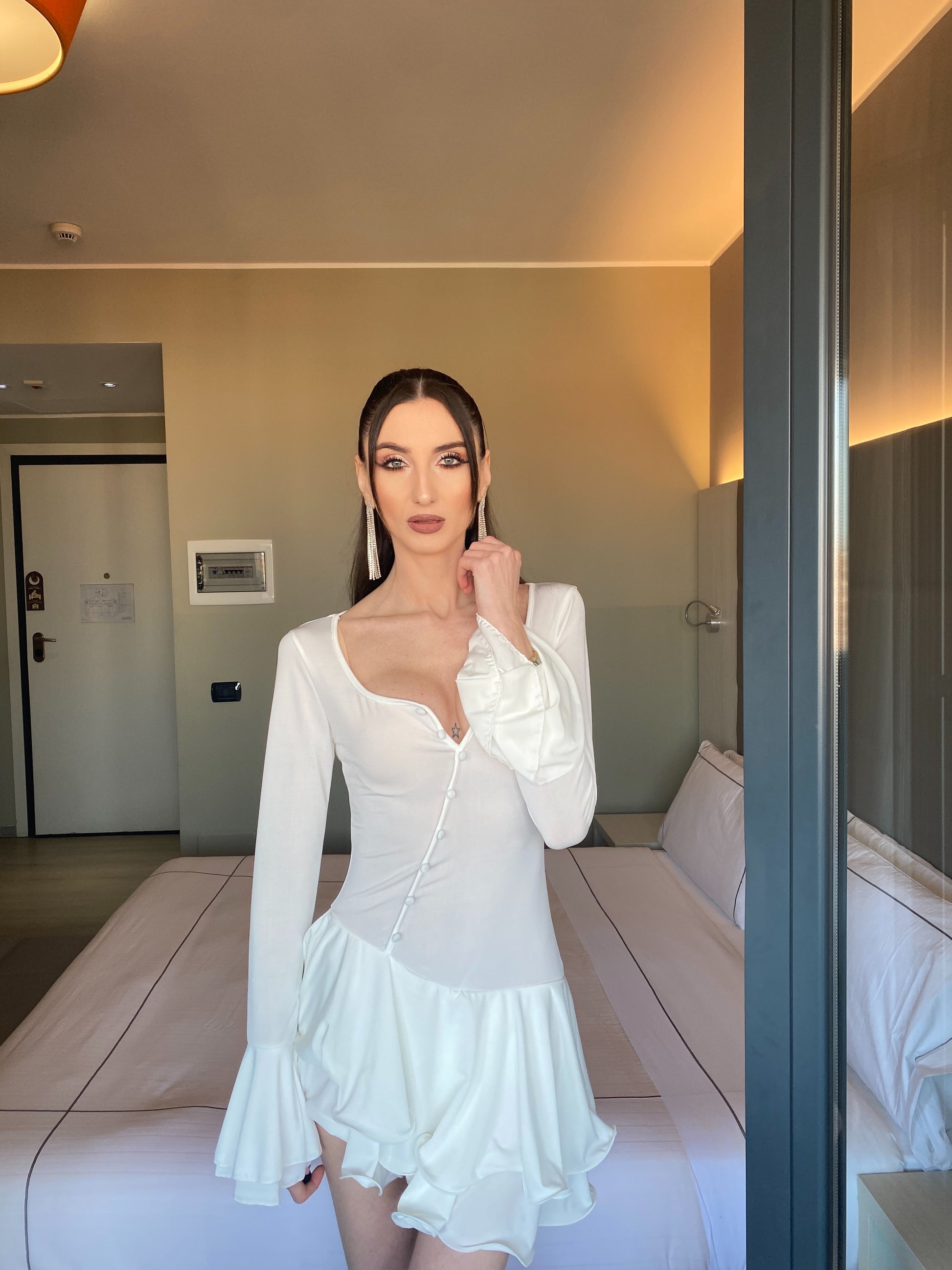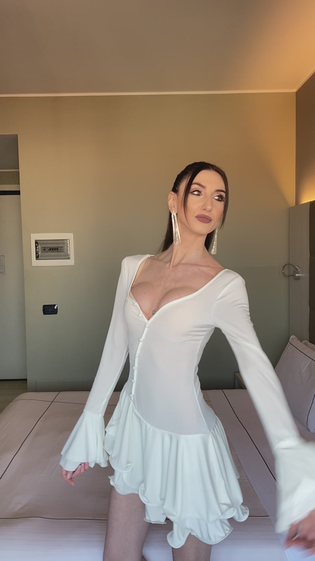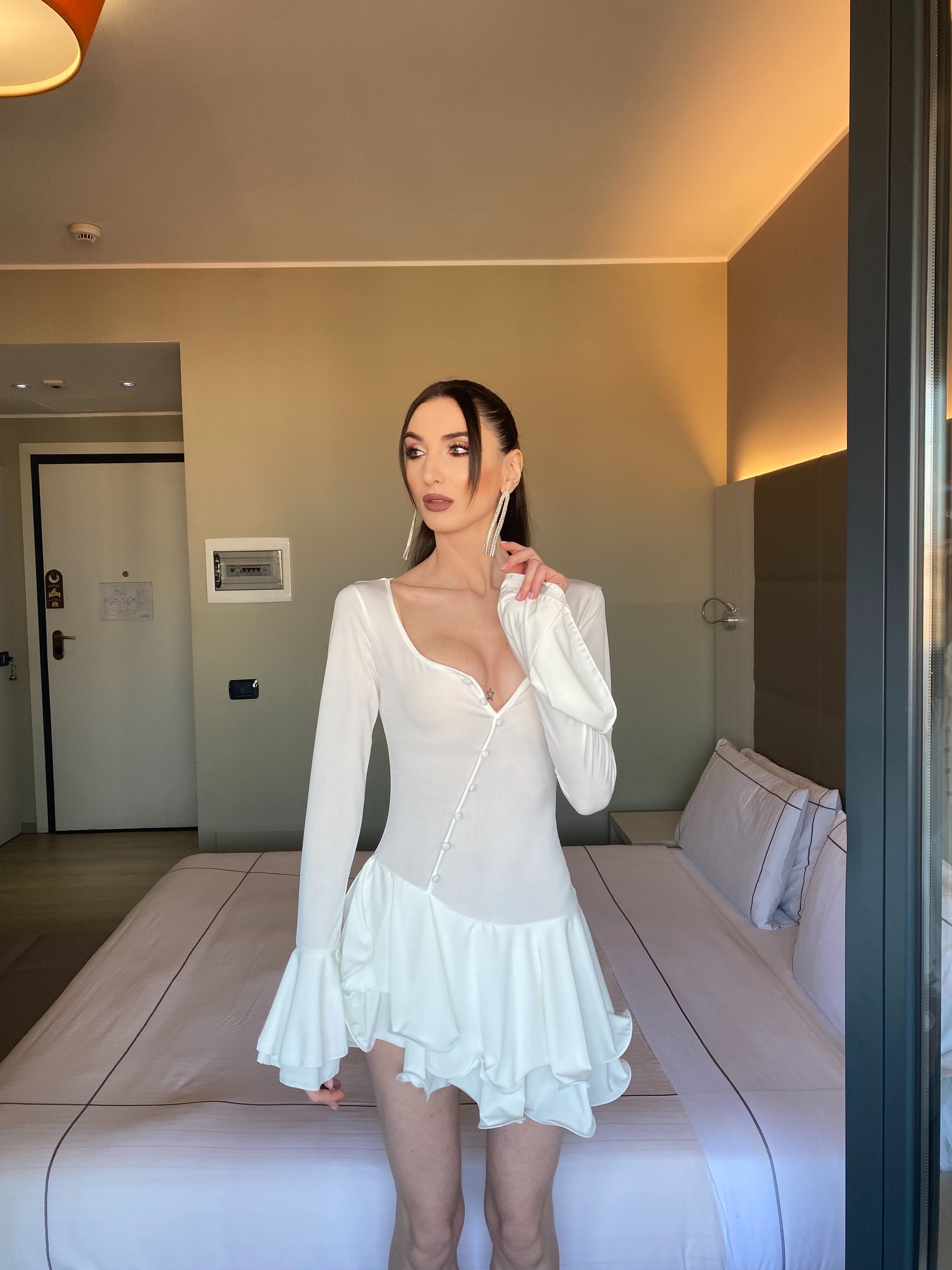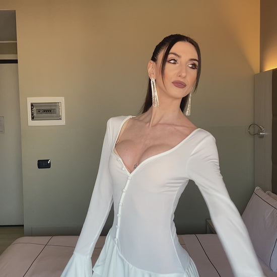 La linea aderente sul busto con bottoncini frontali valorizza la silhouette, mentre la balza finale aggiunge movimento e leggerezza. Le maniche lunghe bilanciano perfettamente la scollatura, creando un effetto elegante e armonioso.