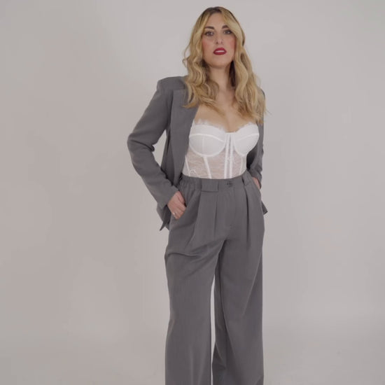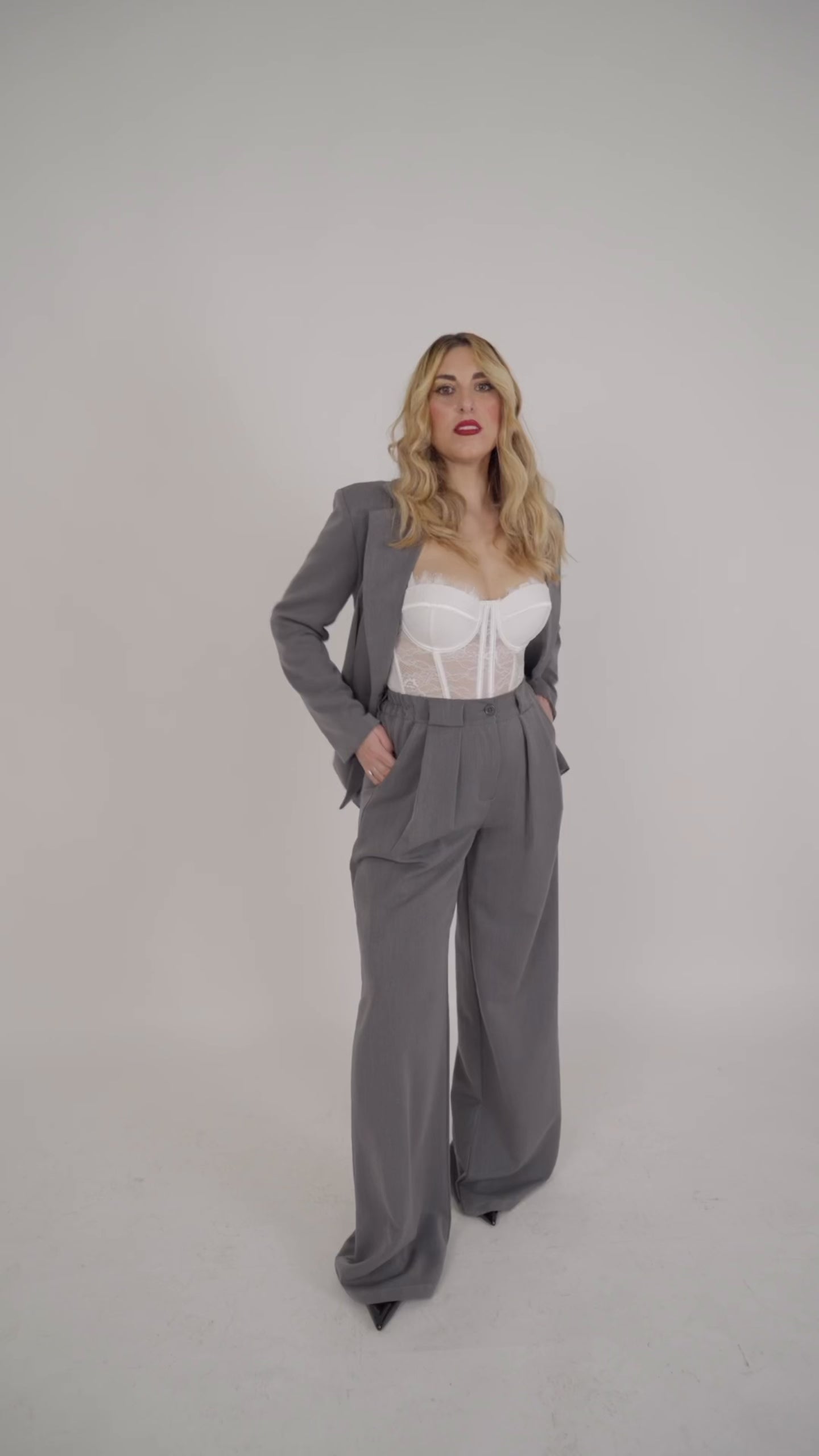 Eleganza e carattere si incontrano in questo tailleur dal taglio sartoriale, pensato per una donna che ama distinguersi con stile. Realizzato in tessuto fluido color taupe, regala un look sofisticato e versatile, perfetto dal giorno alla sera.