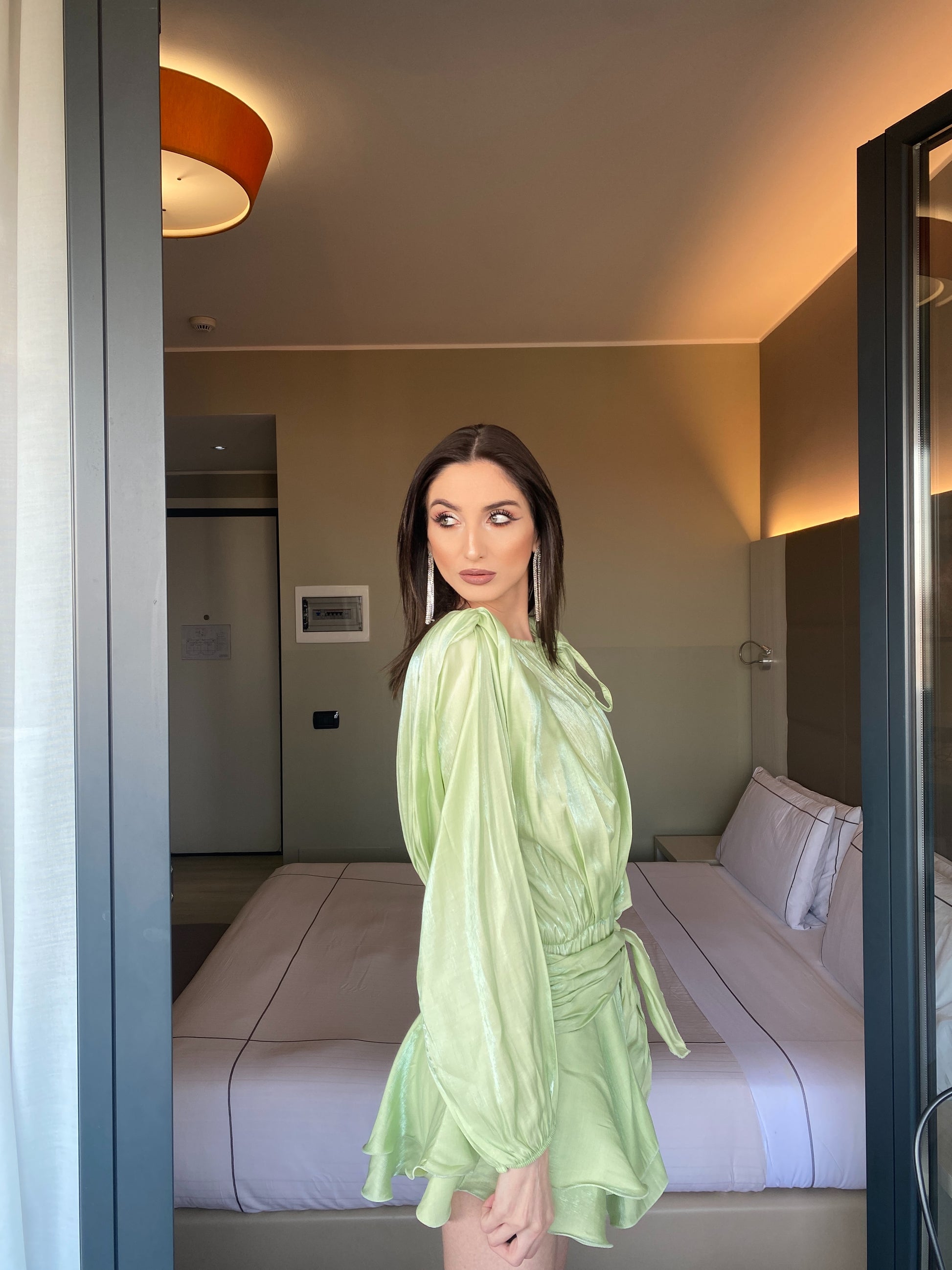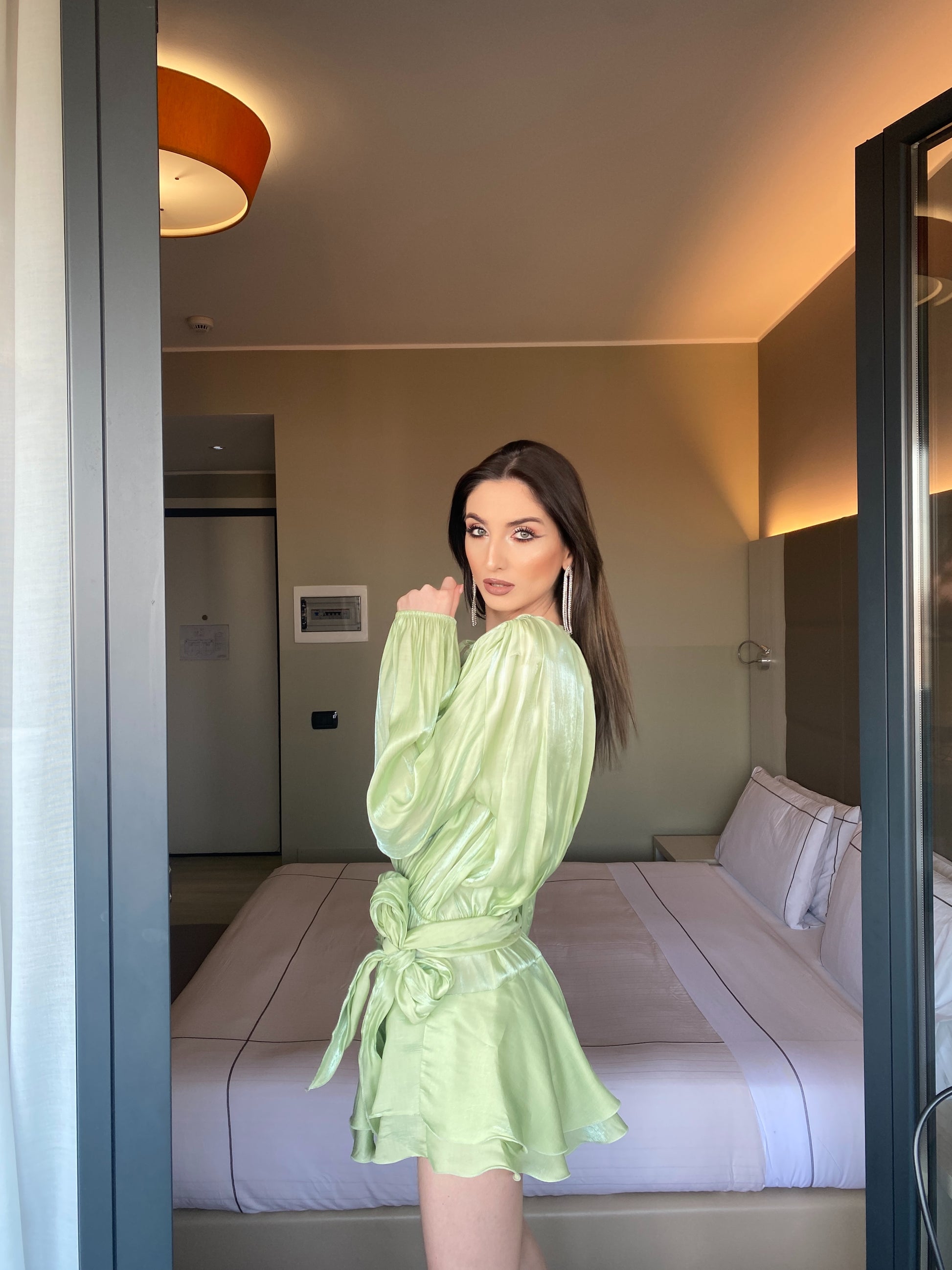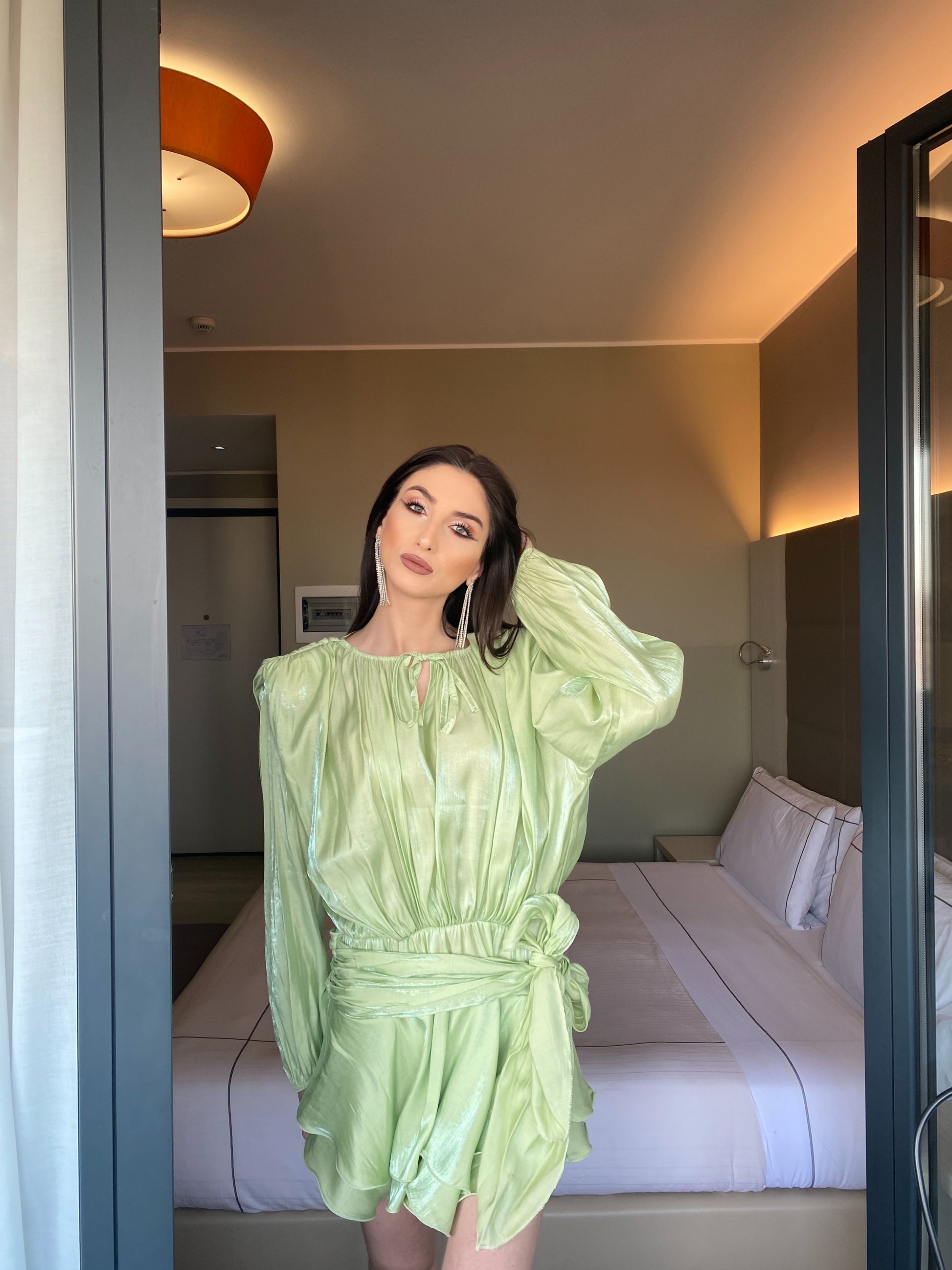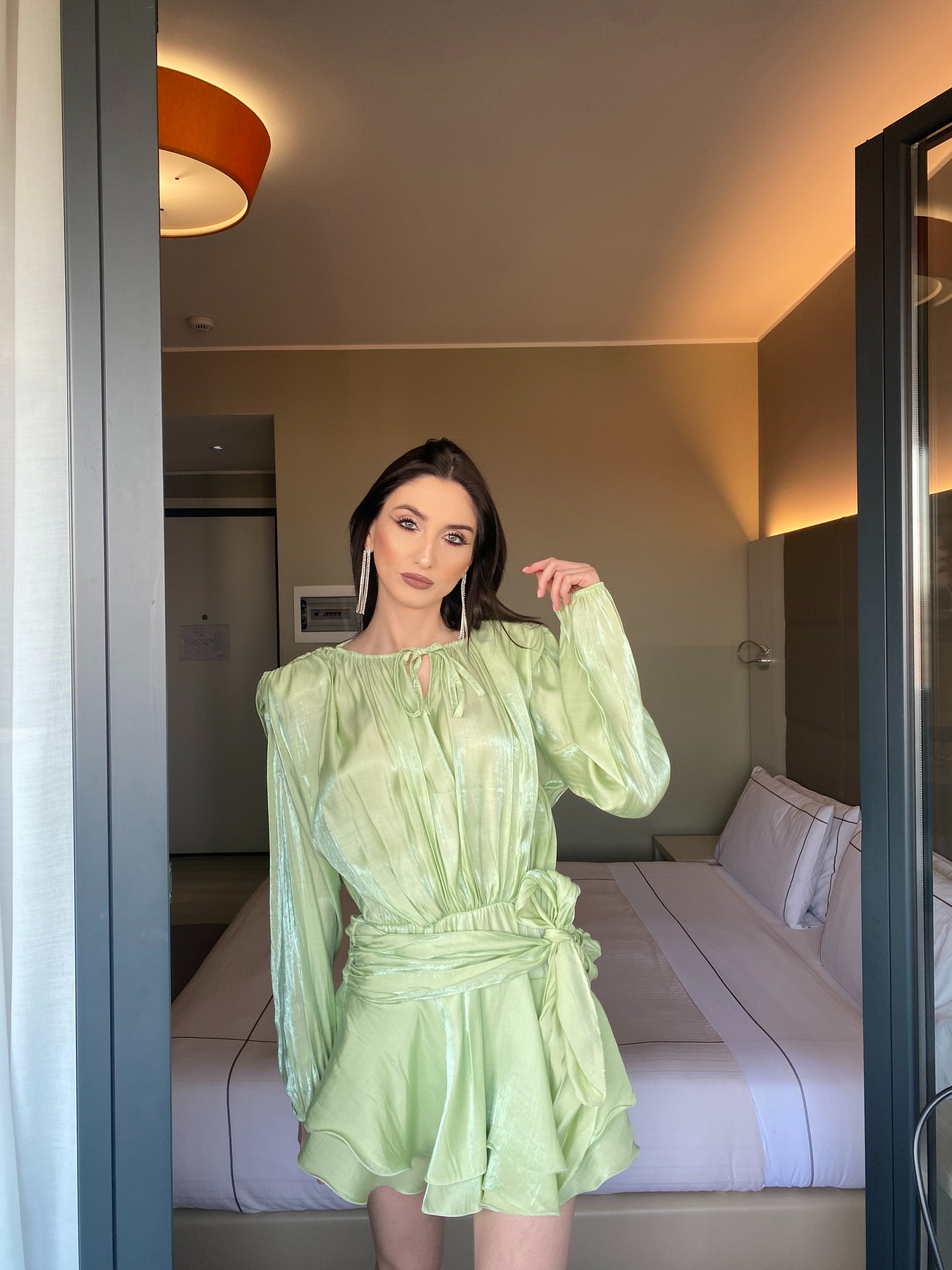 Il tessuto leggero e luminoso si muove con grazia, mentre il punto vita valorizzato dal fiocco esalta la silhouette con delicatezza. Le maniche morbide e il drappeggio fluido donano movimento e femminilità ad ogni passo.